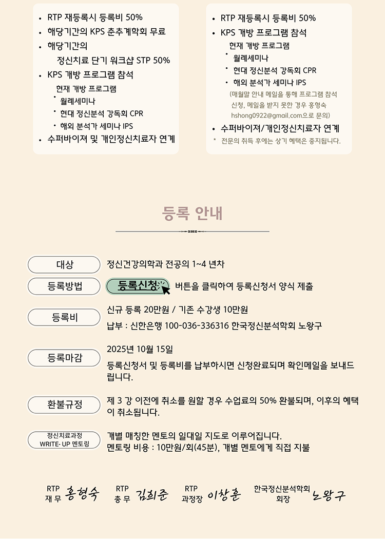 48 | 2025년 RTP 오로지 전공의를 위한 정신분석적 정신치료 : A부터 Z까지 (Part 1) [0] | webmaster | 2025.02.18 | 944 | |